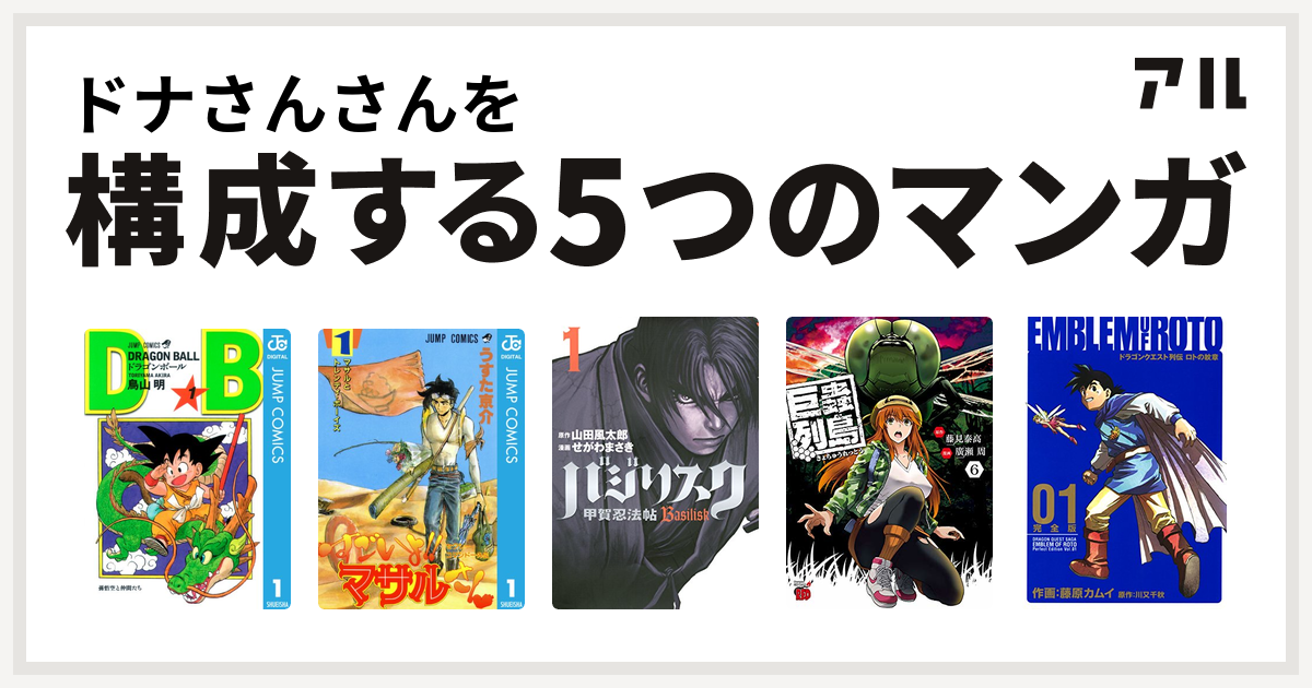 ドナさんさんを構成するマンガはドラゴンボール セクシーコマンドー外伝 すごいよ マサルさん バジリスク 甲賀忍法帖 巨蟲列島 ドラゴンクエスト列伝 ロトの紋章 私を構成する5つのマンガ アル